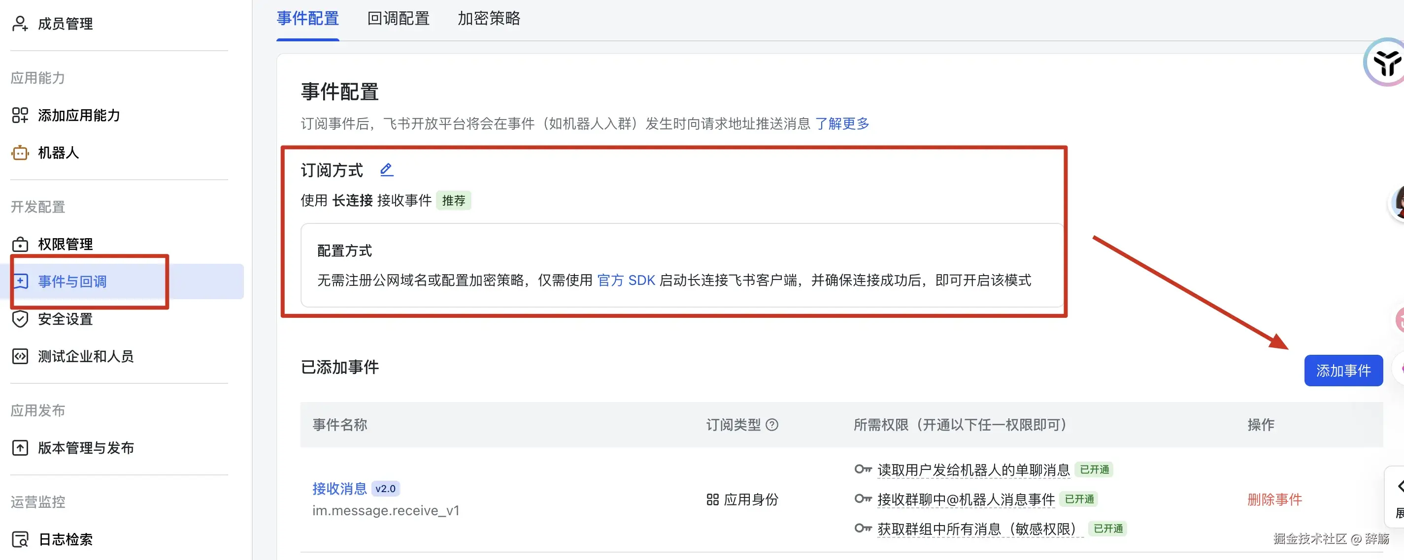 im.message.receive_v1,添加该事件并确认开通对应权限;开通核心权限:左侧菜单栏